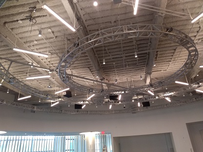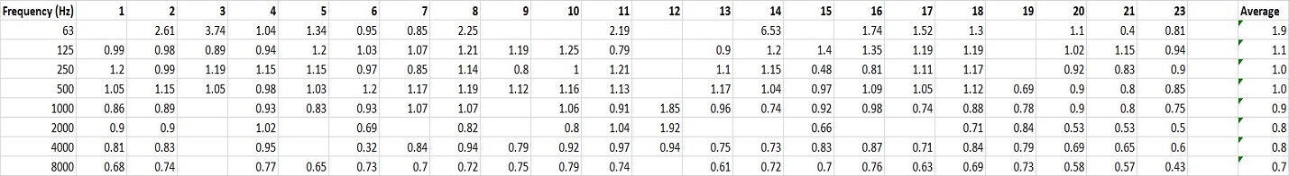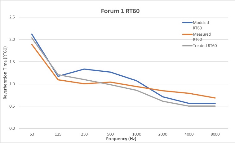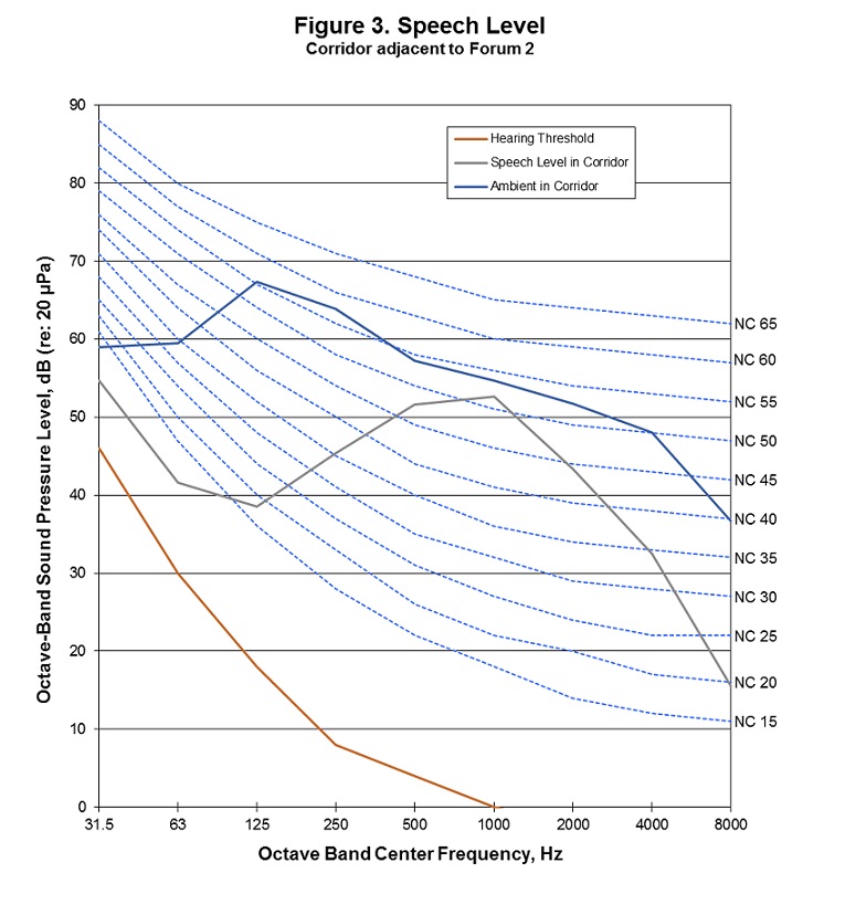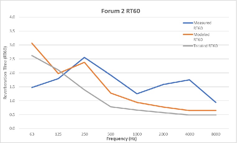 |   Introduction At your request, David Coate Consulting (DCC) analyzed the acoustics associated with the 225 Liberty Street project located in New York City. The project entails the build out of two presentation/meeting areas, each of which is circular in shape. Acoustics in circular rooms is often difficult to address because of focusing and reverberation effects. Such effects can include flutter echoes as well as the perception that a sound source is in closer proximity to the listener than it actually is. Three specific issues were analyzed: • Reverberation in Forum 1 (1st floor) • Reverberation in Forum 2 (2nd floor) • Sound transmission through the glass partition (2nd floor) Acoustical treatments to address these issues are analyzed and recommended. Reverberation Time Measurements The Reverberation Time (RT60) is the time it takes for reverberation to decay 60 decibels. Speech intelligibility decreases with increasing reverberation time. In addition, discrete echoes between hard parallel surfaces can cause focusing, poor imaging and other acoustical issues. Recommended RT60 values for the two forums are in the range of 0.6 to 1.3 seconds in the 500 Hz and 1000 Hz frequency bands. The lower end of this range is desirable from a speech intelligibility standpoint. The RT60 is measured by playing back pink noise (flat frequency response) bursts through a test loudspeaker and measuring the sound level decay with a Type I octave frequency band analyzer. Table 1 shows the results of the Forum 1 measurements. Gaps in the data were caused by extraneous noises occurring during the tests. A large data set was acquired to average out these gaps plus the expected spatial variation in the data. As can be seen from Table 1, the RT60 values at 500 Hz and 1000 Hz are 1.0 and 0.9 seconds, which already meet the design criteria. Table 1. Measured Reverberation Time (RT60) Forum 1  Table 2 shows the results of the Forum 2 measurements. The RT60 values at 500 Hz and 1000 Hz are 1.9 and 1.2 seconds which are higher than the design criteria. The 2.6 second value at 250 Hz is particularly problematic. During the tests, significant flutter echoes and focusing due to the circular room were evident. Table 2. Measured Reverberation Time (RT60) Forum 2   Acoustical Design DCC developed a rudimentary acoustics model to calculate the RT60 for existing conditions for both forums. Interior dimensions and architectural finishes were included in the model. Figure 1 shows measured RT60 versus modeled RT60 with reasonable agreement between the two datasets (within an average of 0.1 seconds). Once it is determined that existing conditions are modeled accurately, a model of proposed treatments can be developed.  Figure 1. Forum 1 RT60 Measured, Modeled, and with Treatments Even though Forum 1 already meets the design criteria, it would benefit acoustically by treating the projection screen wall with absorption treatment. DCC assumed that this wall would be covered with 2” thick Owens Corning 703 semi-rigid fiberglass panels. Several approaches are available to hide this material. Acoustically transparent fabric is often used in such applications and can be stretched to fit curved surfaces. If installed properly, these treatments can be made to look very similar to GWB or plaster surfaces. An example of this type of fabric can be found at http://www.clipsoceilingwall.com/how-it-works/acoustics/ or https://fabricmate.com/. Figure 2 shows measured RT60 versus modeled RT60 for Forum 2. These two datasets are within an average of -0.2 seconds difference, but the agreement is not as good as the datasets in Forum 1. The likely reason for this is due to the very noticeable focusing effects in this space. Software-based ray tracing techniques would achieve better modeling results but are outside the scope of this present task. Regardless, it is evident that additional robust absorption treatments are needed in this space.  Figure 2. Forum 2 RT60 Measured, Modeled, and with Treatments The primary culprit of focusing in this space appears to be caused by the vertical 9’ circular GWB area just below the ceiling (treated with spray-on Pyrok acoustical treatment). DCC assumed that this entire area would be treated with 2” thick Owens Corning 703 semi-rigid fiberglass panels and hidden with acoustically transparent fabric. In addition, our treatment model also assumed that heavy drapes would cover the existing glass perimeter walls. For this analysis, we assumed cotton curtains (0.5kg/m2), draped to 75% area 130mm from wall. This treatment would provide needed absorption as well as eliminate the specular reflections off the glass. The treated RT60 values at 500 Hz and 1000 Hz are 0.8 and 0.7 seconds which would meet the design criteria. Glass Wall Sound Transmission DCC employed a test loudspeaker and pink noise source to measure the Noise Level Reduction of the glass wall separating Forum 2 from the adjacent corridor. Based on the measurement data, it appears that this is not laminated glass (with high sound reduction performance), but rather ½” inch insulated glass. Figure 3 shows the sound level of a raised male voice (at 3’) attenuated by this glass wall compared with measured ambient sound levels in the hall. For this example, speech would not likely be discernable since it is below ambient sound levels.  |