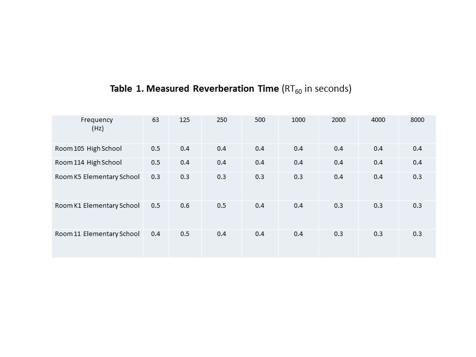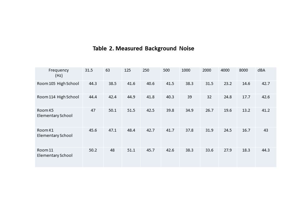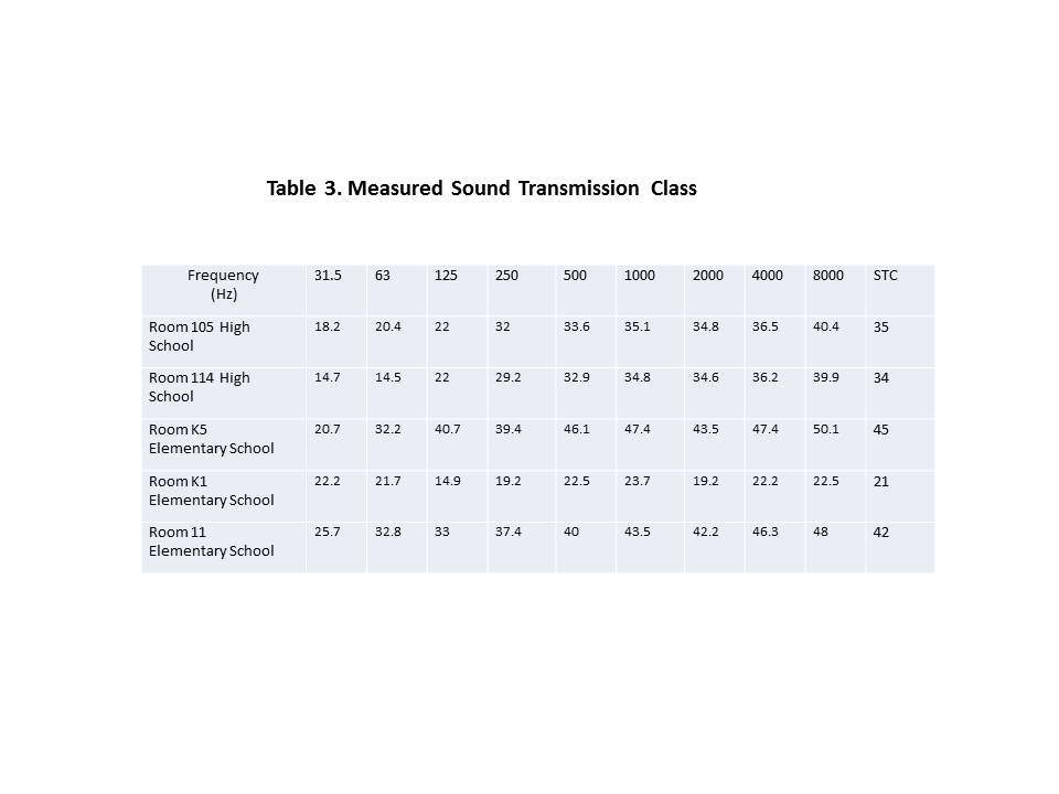 | Introduction David Coate Consulting (DCC) conducted acoustical testing on February 23, 2012 in several classrooms in both the North Smithfield Rhode Island High School and Elementary School. The main focus of this study was to determine whether or not the unit ventilators meet relevant noise standards. The specific acoustical characteristics of individual classrooms are also important since they can affect unit ventilator noise levels and/or speech intelligibility. The ANSI S12.60-2002 Classroom Acoustics Standard was used as the basis of this study. This standard calls for measurement of background noise due to unit ventilators, the reverberation time of the rooms, and the transmission loss of walls dividing classrooms from activity areas such as hallways. The ANSI Classroom Acoustics Standard was developed to address the fact that verbal communication and accurate listening conditions are critical for the classroom learning experience. Reverberation Reverberation in classrooms and other teaching spaces is essentially the effect of sound reflecting off various hard surfaces within the space. The net effect of reverberation, a combination of many echoes, is perceived as a longer incoherent or ‘blurry’ echo that can interfere with speech communication. Reverberation time is typically measured in octave bands and is designated RT60, or the time it takes sound levels to decay 60 decibels (dB). In general, the larger the room, the greater the reverberation time. Speech interference increases with increasing reverberation time. The ANSI S12.60-2002 Classroom Acoustics Standard specifies that the RT60 for classrooms should be at or below 0.6 seconds for small classrooms and 0.7 seconds for mid-size classrooms, for the upper mid-frequencies (500, 1000, and 2000 Hz). Small classrooms are defined as less than 10,000 ft3 and mid-sized classrooms are defined as greater than 10,000 ft3 but less than 20,000 ft3. The ANSI standard does not delineate RT60 values for learning spaces greater than 20,000 ft3 but instead provides more general guidelines. I measured the RT60 at a number of locations within each space tested, and then averaged the results. Reverberation time can vary both spatially and temporally because of a number of factors including room geometry and therefore averaging is important. Table 1 shows the results of these tests.  Measured reverberation times meet the ANSI standard for all classrooms tested. All of the rooms tested had acoustical ceiling tiles (ACT) which provides enough sound absorption to meet the RT60 standard. Background Noise Background noise in classrooms can be problematic if background noise levels are sufficiently high. High background noise levels can reduce the signal to noise ratio needed to properly understand verbal communication. That is, if high enough, background noise can mask speech or cause it to be unintelligible. The ANSI standard calls for background noise (e.g., caused by HVAC systems) to be at or less than 35 dBA. As shown in Table 2, all the rooms tested failed the background noise test. In all rooms tested, the unit ventilators generated noise levels in excess of 35 dBA, by as much as 6 to 9 dBA. By way of context, a 3 dBA increase is barely noticeable, a 5 dBA increase is substantial, and a 10 dBA increase is perceived as a doubling in loudness. While these unit ventilators exceed the ANSI standard by a substantial margin, many schools with unit ventilators experience noise levels in this general range. Each room was also tested with the unit ventilators off. Under that condition Room 105, Room 114, and Room K1 tested below the 35 dBA limit while Room K5 and Room 11 tested above the 35 dBA limit. With unit ventilators off, exhaust fan and water valve noise was audible in Room K5. With the unit ventilator off, exhaust fan noise was very audible in Room 11. The high fan speed on the unit ventilators results in approximately 3 dBA higher noise levels than on the low speed setting.  Wall Noise Reduction Transmission Loss (TL) or Noise Level Reduction (NLR) , is the amount of noise reduction a wall or other partition provides. For classrooms with corridors adjacent to the space, ANSI recommends a minimum Sound Transmission Class (STC) of 45. Table 3 shows the measured results for each room. These particular STC measurements were for the classroom walls between the classroom and adjacent corridor.  As can be seen from this table, only Room K5 met the ANSI STC 45 criterion. However, these particular walls are quite robust, consisting of at least six inch thick masonry and the low STC results are very likely due to sound leaks around the perimeter of classroom doors. A six inch thick masonry wall should readily achieve STC 45 or greater. Consequently, very simple and inexpensive means of sealing the doors in these rooms will likely increase the overall STC to 45. The recommendations section provides details on how to seal these doors. Recommendations Sound Absorption Treatments Since all of the tested learning spaces pass the RT60 test, no additional sound absorption treatments are needed. Unit Ventilators The unit ventilators failed the background noise test in all rooms tested. In addition, exhaust fans (that could not be turned off) failed the background noise test in certain rooms. While retro-fit noise control measures for the unit ventilators may be possible, the costs of doing so may be higher than replacing the units with modern ones that are specified to meet the 35 dBA limit. On the other hand, installation of new HVAC equipment to meet stringent noise limits can also be expensive and in some cases impractical from an engineering perspective. However, even if the unit ventilators were replaced or retrofit to meet the 35 dBA limit, certain rooms in the Elementary school with separate exhaust fans would still be above the 35 dBA limit and would require additional sound reduction. In many cases, excessive exhaust fan noise is caused by high fa