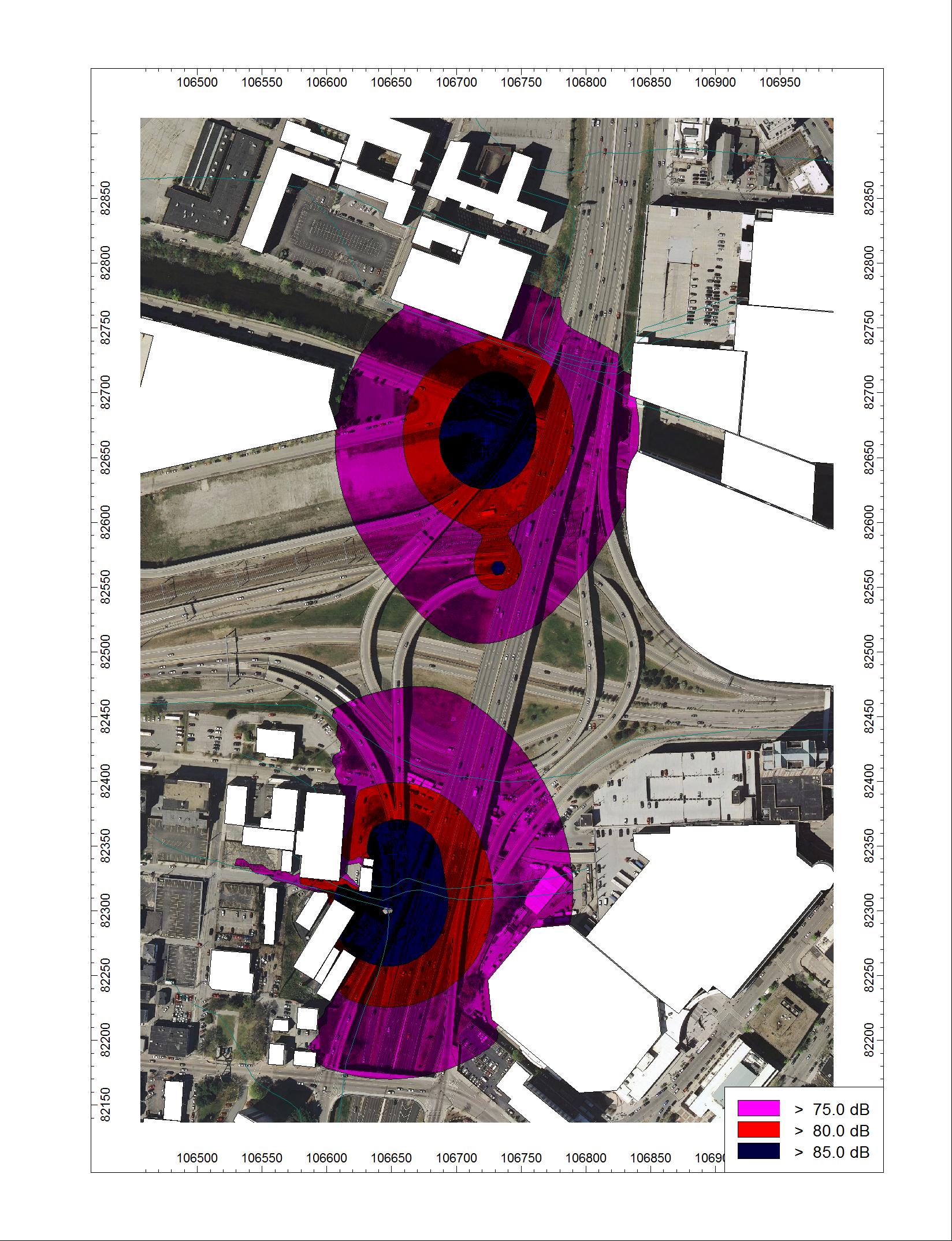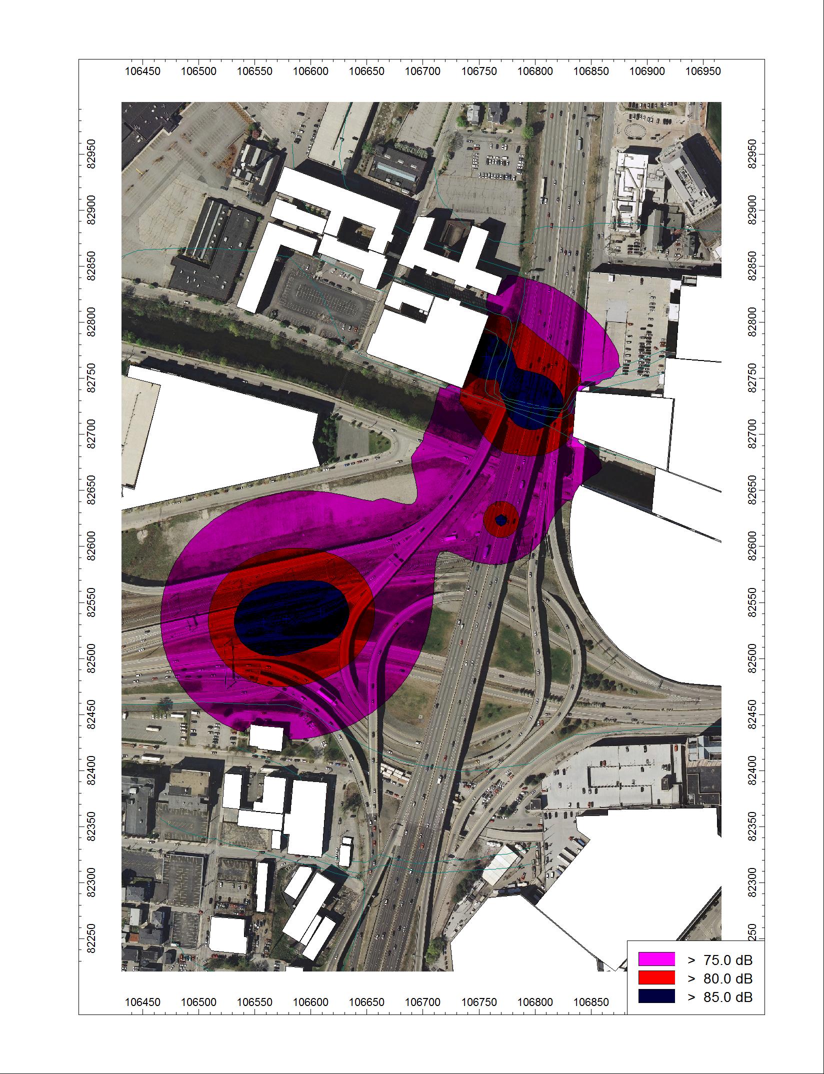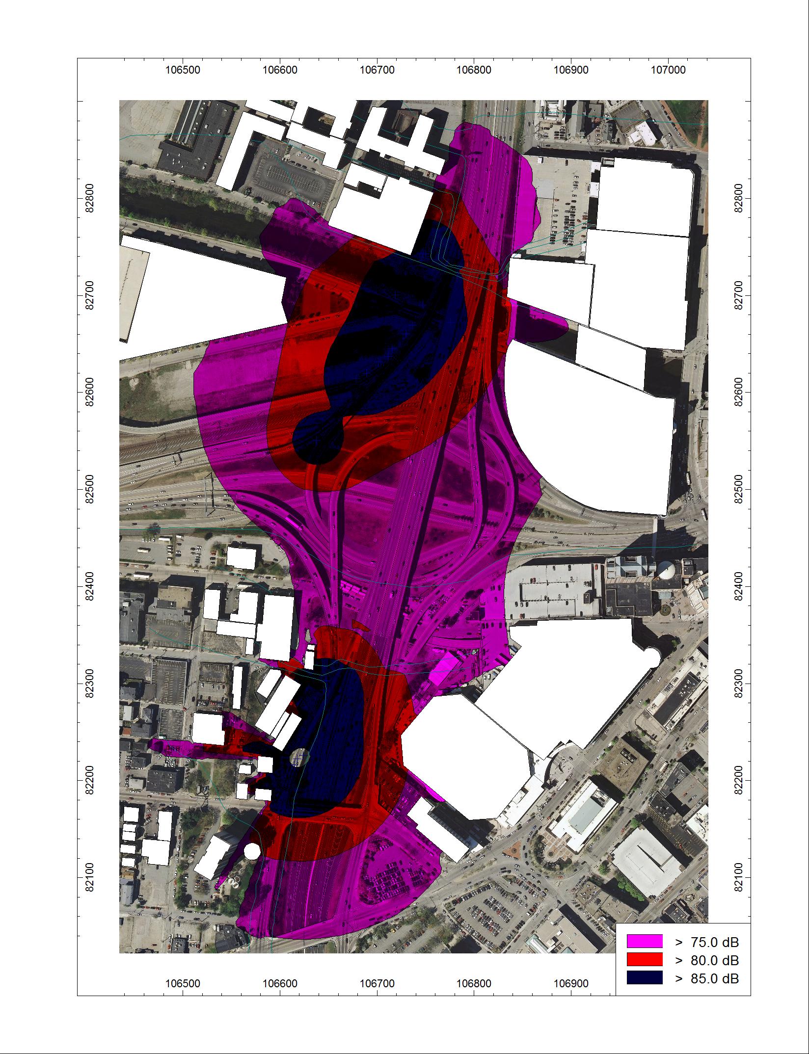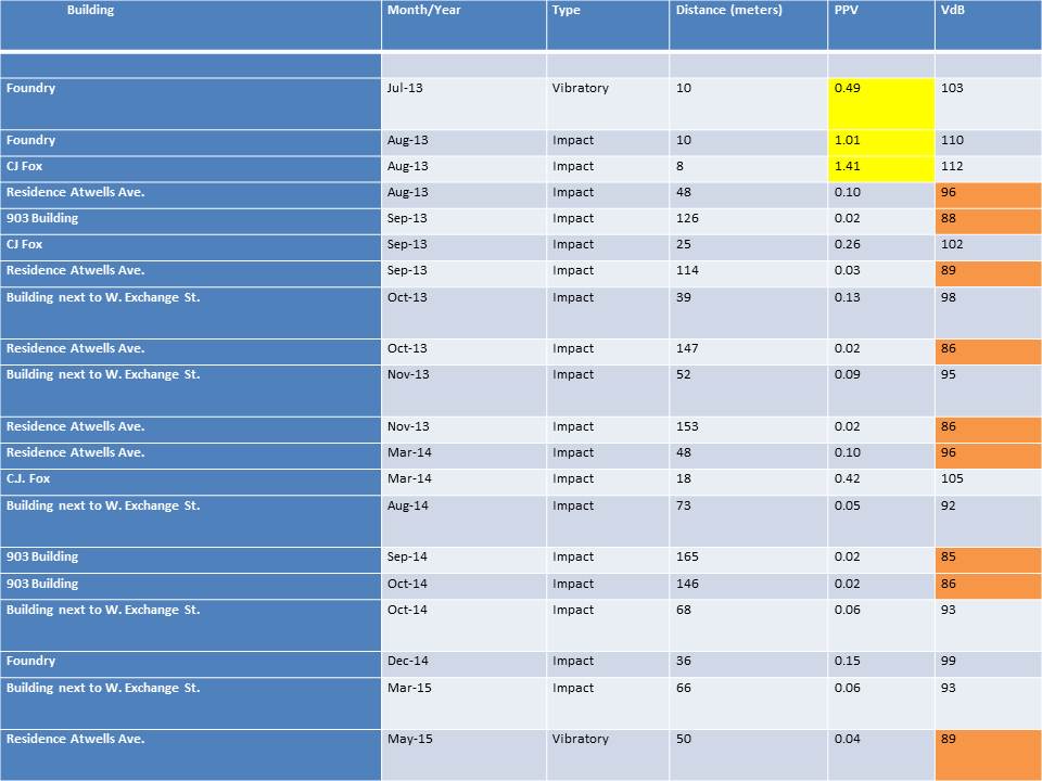 |  1. Introduction David Coate Consulting (DCC) conducted noise and vibration analyses to assess potential impacts associated with pile driving for the Providence Viaduct Project in Providence, Rhode Island. Construction plans for this highway project call for pile driving in the project area for well over a year. Buildings in the immediate vicinity of pile driving include commercial facilities as well as some residential locations. No vibration-sensitive commercial (e.g. high resolution imaging equipment) facilities are in the immediate vicinity. This following documents pile driving noise and vibration modeling, ambient noise measurements, mitigation, and recommendations. 2. Pile Driving Noise Modeling The Federal Transit Administration (FTA) and Federal Highway Administration (FHWA) have developed standardized construction noise and vibration prediction (modeling) and assessment methods. In addition, Boston’s central artery “big dig” (CAT) project resulted in some pioneering construction noise and vibration control because of the long term nature of construction as well as close proximity of residences to construction activity. The noise and vibration source level data and methods used in the present study are based on FTA, FHWA, and CAT methodologies. FTA’s construction noise methodology is suitable in this case to evaluate potential noise impacts by month. It is important in this case to evaluate noise impacts over time and over the duration of the project since pile driving activities would move relative to various receptor (building) locations. This in turn would change noise levels at receptor locations. FTA’s thirty day construction noise impact criteria are shown in Table 1.  Both impact hammer pile and vibratory sheet driving methods are planned for the project. Vibratory driving generally produces lower noise levels than generated by impact hammer pile driving. Construction noise methods employ a “useage” factor, a means of adjusting noise levels to account for how much the equipment will be used over the course of a day. This is important for pile driving not only in terms of the duration of pile driving, but also the amount of time between impacts. Table 2 shows source pile driving noise levels used for the noise modeling.  Appendix A includes the planned pile driving schedule by month. This data was used to calculate the cumulative effects of the two different types of pile driving, pile driving locations, durations, and whether or not pile driving would occur at night. These calculated source noise level results were used as input to CADNA to generate noise contours. CADNA is an internationally recognized 3D noise modeling software package. Topographic noise contours were digitized and input into CADNA as well as building footprints and elevations. Such obstacles are important considerations for outdoor sound propagation since buildings and terrain can “block” sound to a certain degree. Pile driving locations by month were input into CADNA as well as elevations these locations. It was assumed that pile driving source heights would be 9.1 meters above the ground elevations. This value is half of the typical 18.2 meter starting elevation as the pile is being driven into the ground. Pile driving source height would affect shielding effects due to buildings or other barriers, and thus an average height is a suitable modeling assumption. Figure 1 through 12 show pile driving noise contours by month. Figure 1 shows pile driving DNL noise contours for July 2013. The outer magenta color is DNL 75, which represents an impact for residential receptors. As can be seen from this figure, there are no residential buildings at DNL 75 for this month, so no residential mitigation would be needed. However, the foundry building immediately adjacent to pile driving would be above the 80 dBA Leq criteria. Please note that the DNL contours shown in Figure 1 do not correspond to Leq, but subsequent Leq contour analysis reveals that the foundry building would be exposed to noise levels of 85 dBA Leq.  Figure 2 shows pile driving DNL noise contours for August 2013. As can be seen by this figure, the 903 residential building to the west of the project would be exposed to noise levels of DNL 75 and higher and therefore mitigation should be considered if feasible and reasonable. No other residential locations would experience noise levels in excess of the residential criterion. Subsequent Leq noise contour analysis reveals that the foundry would be at 94 dBA Leq, the C.J. Fox building would be at 93 dBA, and the bar (Saints and Sinners Lounge) adjacent to the C.J. Fox building would be at 82 dBA. These locations would be above the commercial use limit of 80 dBA Leq.  Figure 3 shows pile driving DNL noise contours for September 2013. No residential buildings are included in the 75 DNL noise contours. However subsequent Leq contour analysis reveals that the foundry would be at 80 dBA and the C.J. Fox building and adjacent bar would be at 84 dBA, at or above the commercial use limit of 80 dBA Leq.  Figure 4 shows pile driving DNL noise contours for October 2013. No residential buildings are included in the 75 DNL noise contours. However subsequent Leq contour analysis reveals that the commercial building next to W. Exchange Street would be at 80 dBA, at the commercial use limit of 80 dBA Leq.  Figure 5 shows pile driving DNL noise contours for November 2013. No residential buildings are included in the 75 DNL noise contours. However subsequent Leq contour analysis reveals that the commercial building next to W. Exchange Street would be at 80 dBA, at the commercial use limit of 80 dBA Leq.  Figure 6 shows pile driving DNL noise contours for March 2014. Two residential buildings are included in the 75 DNL noise contours. Subsequent Leq contour analysis reveals that one commercial building near Atwell’s Avenue would be at the commercial use limit of 80 dBA Leq.  Figure 7 shows pile dri
