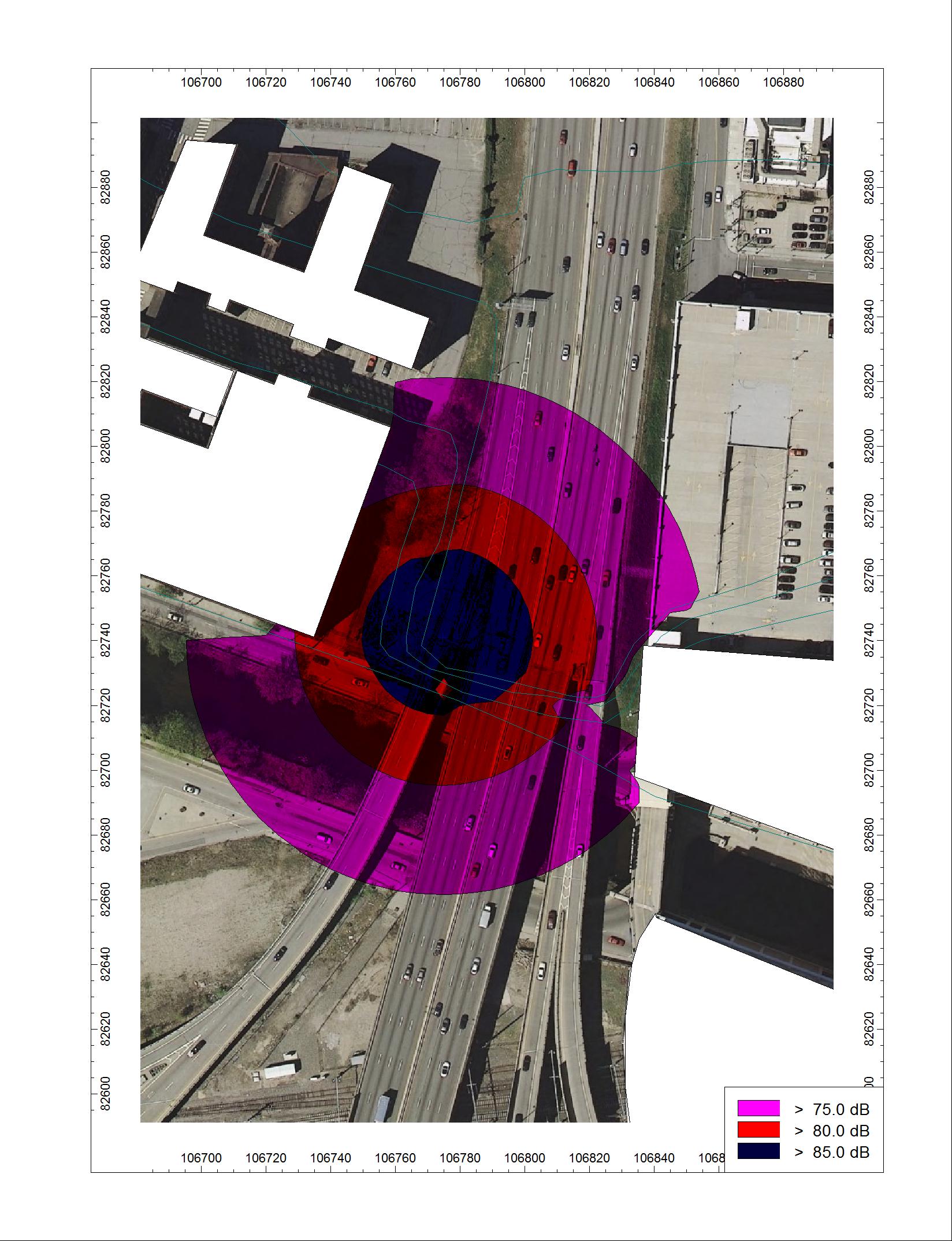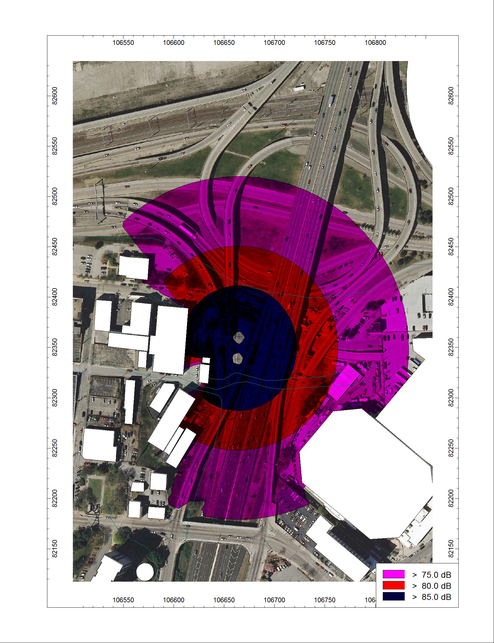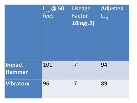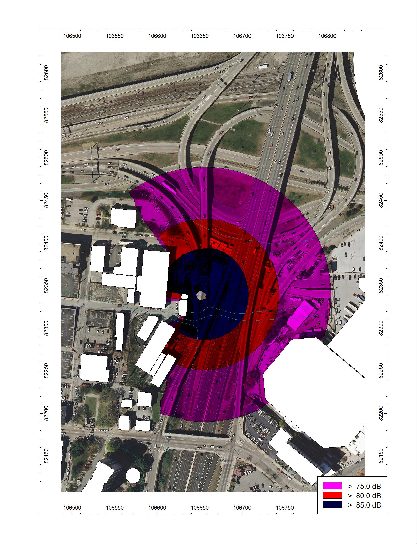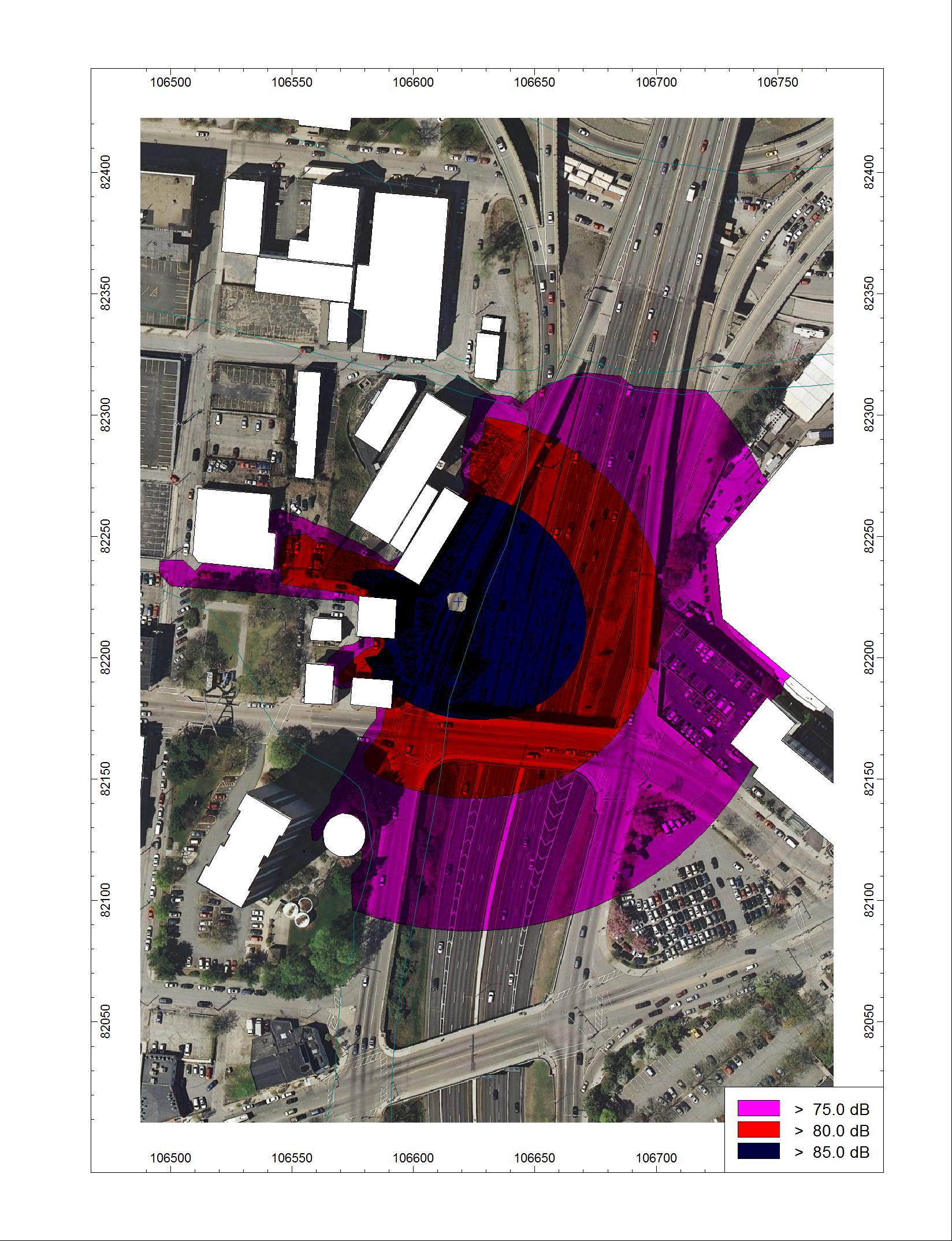 |  1. Introduction David Coate Consulting (DCC) conducted noise and vibration analyses to assess potential impacts associated with pile driving for the Providence Viaduct Project in Providence, Rhode Island. Construction plans for this highway project call for pile driving in the project area for well over a year. Buildings in the immediate vicinity of pile driving include commercial facilities as well as some residential locations. No vibration-sensitive commercial (e.g. high resolution imaging equipment) facilities are in the immediate vicinity. This following documents pile driving noise and vibration modeling, ambient noise measurements, mitigation, and recommendations. 2. Pile Driving Noise Modeling The Federal Transit Administration (FTA) and Federal Highway Administration (FHWA) have developed standardized construction noise and vibration prediction (modeling) and assessment methods. In addition, Boston’s central artery “big dig” (CAT) project resulted in some pioneering construction noise and vibration control because of the long term nature of construction as well as close proximity of residences to construction activity. The noise and vibration source level data and methods used in the present study are based on FTA, FHWA, and CAT methodologies. FTA’s construction noise methodology is suitable in this case to evaluate potential noise impacts by month. It is important in this case to evaluate noise impacts over time and over the duration of the project since pile driving activities would move relative to various receptor (building) locations. This in turn would change noise levels at receptor locations. FTA’s thirty day construction noise impact criteria are shown in Table 1.  Both impact hammer pile and vibratory sheet driving methods are planned for the project. Vibratory driving generally produces lower noise levels than generated by impact hammer pile driving. Construction noise methods employ a “useage” factor, a means of adjusting noise levels to account for how much the equipment will be used over the course of a day. This is important for pile driving not only in terms of the duration of pile driving, but also the amount of time between impacts. Table 2 shows source pile driving noise levels used for the noise modeling.  Appendix A includes the planned pile driving schedule by month. This data was used to calculate the cumulative effects of the two different types of pile driving, pile driving locations, durations, and whether or not pile driving would occur at night. These calculated source noise level results were used as input to CADNA to generate noise contours. CADNA is an internationally recognized 3D noise modeling software package. Topographic noise contours were digitized and input into CADNA as well as building footprints and elevations. Such obstacles are important considerations for outdoor sound propagation since buildings and terrain can “block” sound to a certain degree. Pile driving locations by month were input into CADNA as well as elevations these locations. It was assumed that pile driving source heights would be 9.1 meters above the ground elevations. This value is half of the typical 18.2 meter starting elevation as the pile is being driven into the ground. Pile driving source height would affect shielding effects due to buildings or other barriers, and thus an average height is a suitable modeling assumption. Figure 1 through 12 show pile driving noise contours by month. Figure 1 shows pile driving DNL noise contours for July 2013. The outer magenta color is DNL 75, which represents an impact for residential receptors. As can be seen from this figure, there are no residential buildings at DNL 75 for this month, so no residential mitigation would be needed. However, the foundry building immediately adjacent to pile driving would be above the 80 dBA Leq criteria. Please note that the DNL contours shown in Figure 1 do not correspond to Leq, but subsequent Leq contour analysis reveals that the foundry building would be exposed to noise levels of 85 dBA Leq.  Figure 2 shows pile driving DNL noise contours for August 2013. As can be seen by this figure, the 903 residential building to the west of the project would be exposed to noise levels of DNL 75 and higher and therefore mitigation should be considered if feasible and reasonable. No other residential locations would experience noise levels in excess of the residential criterion. Subsequent Leq noise contour analysis reveals that the foundry would be at 94 dBA Leq, the C.J. Fox building would be at 93 dBA, and the bar (Saints and Sinners Lounge) adjacent to the C.J. Fox building would be at 82 dBA. These locations would be above the commercial use limit of 80 dBA Leq.  Figure 3 shows pile driving DNL noise contours for September 2013. No residential buildings are included in the 75 DNL noise contours. However subsequent Leq contour analysis reveals that the foundry would be at 80 dBA and the C.J. Fox building and adjacent bar would be at 84 dBA, at or above the commercial use limit of 80 dBA Leq.  Figure 4 shows pile driving DNL noise contours for October 2013. No residential buildings are included in the 75 DNL noise contours. However subsequent Leq contour analysis reveals that the commercial building next to W. Exchange Street would be at 80 dBA, at the commercial use limit of 80 dBA Leq.  Figure 5 shows pile driving DNL noise contours for November 2013. No residential buildings are included in the 75 DNL noise contours. However subsequent Leq contour analysis reveals that the commercial building next to W. Exchange Street would be at 80 dBA, at the commercial use limit of 80 dBA Leq.  Figure 6 shows pile driving DNL noise contours for March 2014. Two residential buildings are included in the 75 DNL noise contours. Subsequent Leq contour analysis reveals that one commercial building near Atwell’s Avenue would be at the commercial use limit of 80 dBA Leq.  Figure 7 shows pile dri