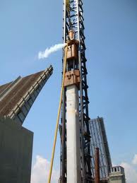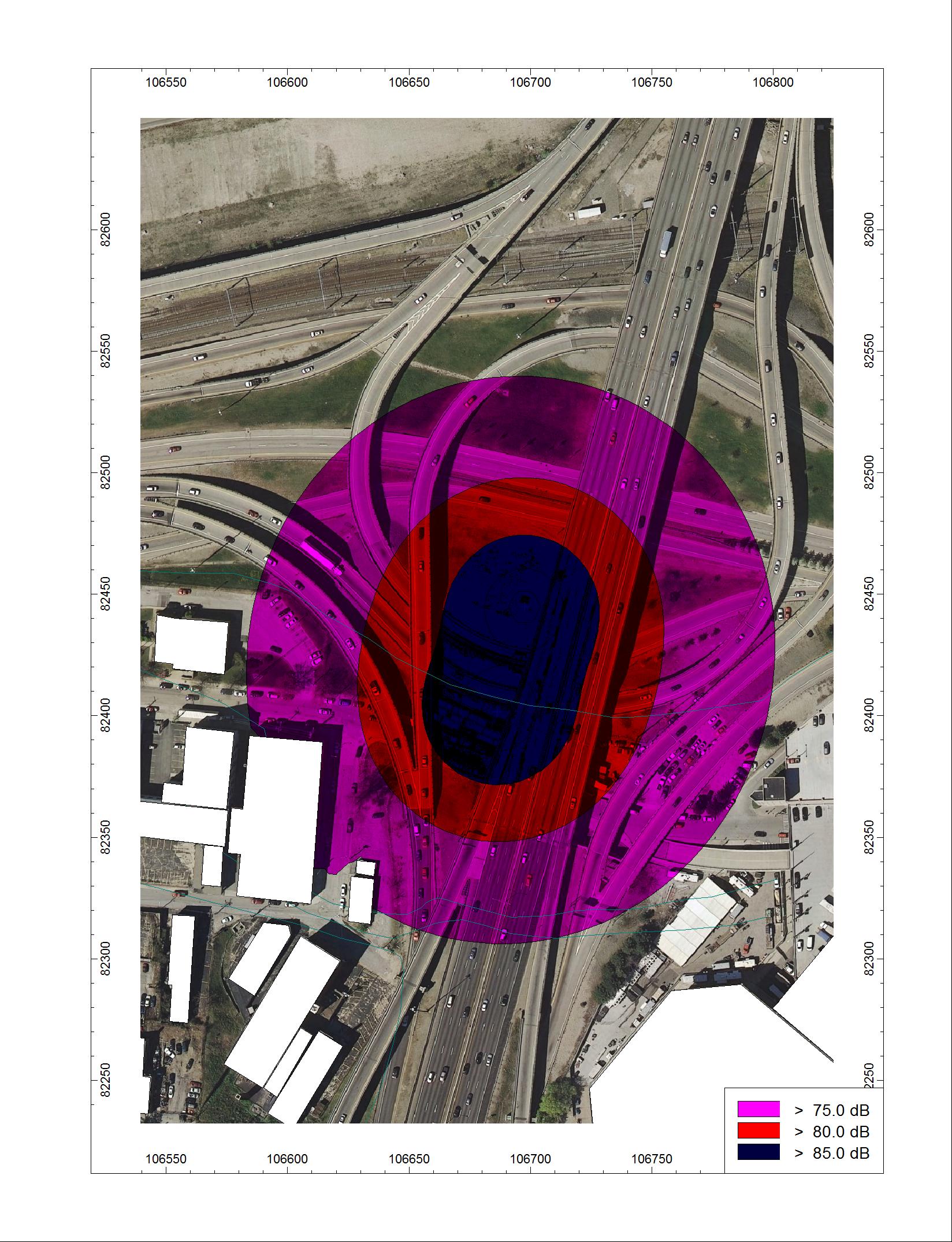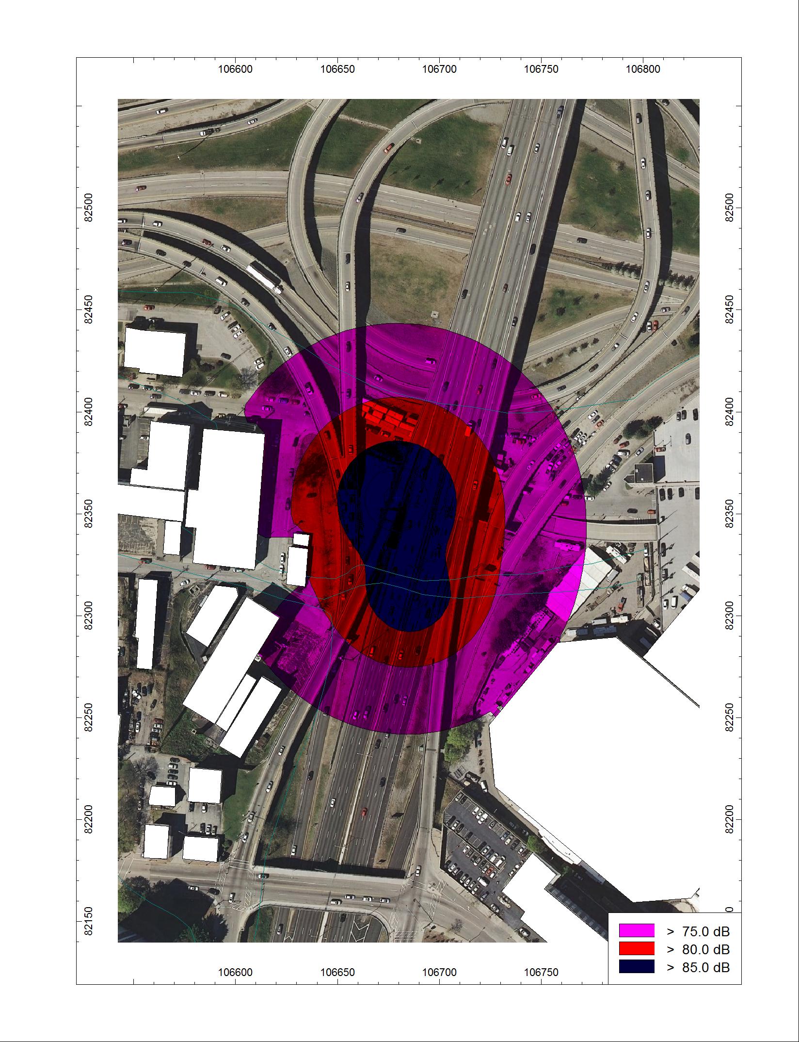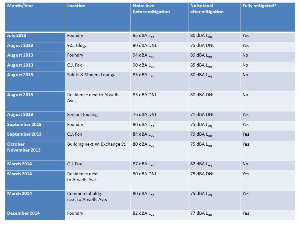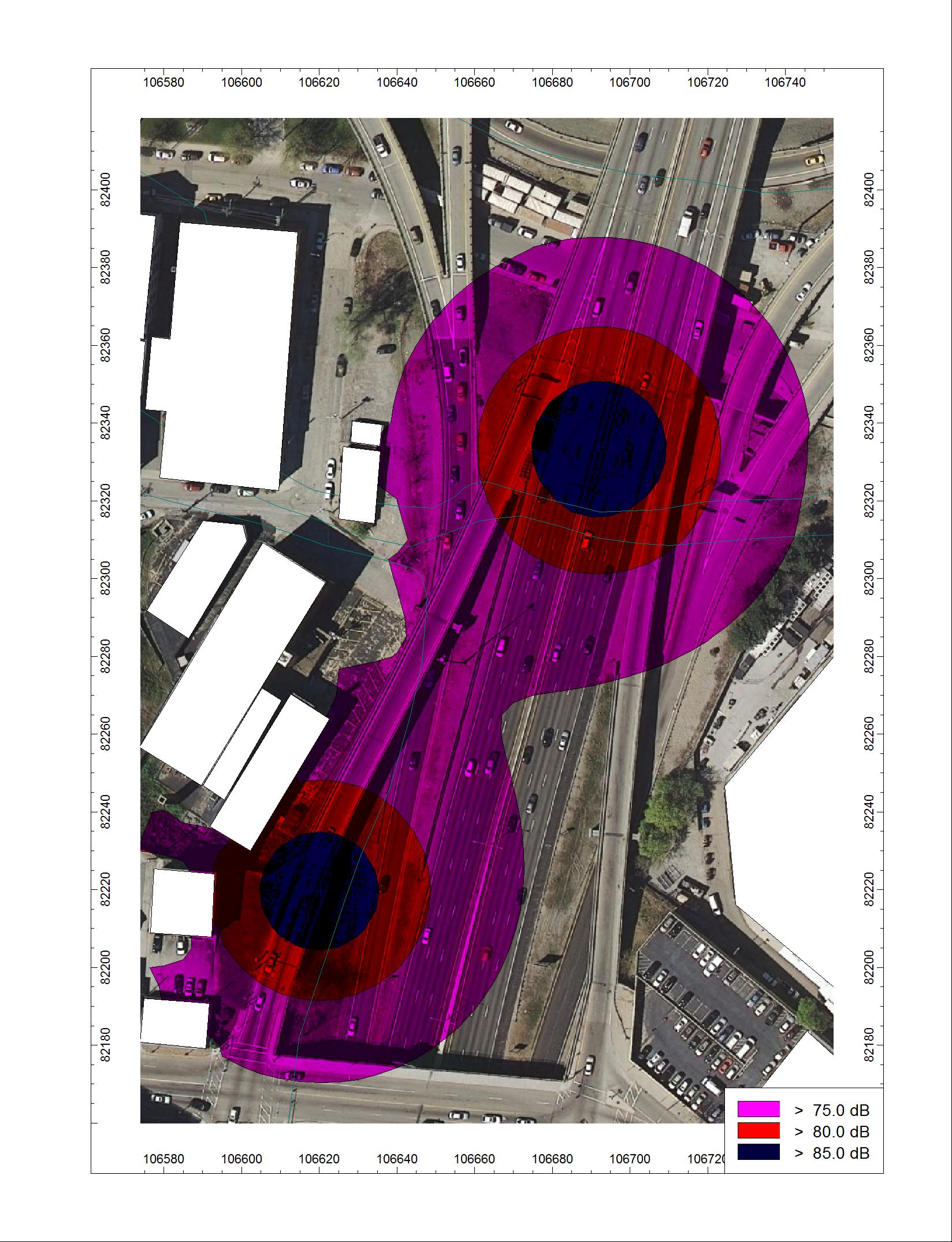 |  1. Introduction David Coate Consulting (DCC) conducted noise and vibration analyses to assess potential impacts associated with pile driving for the Providence Viaduct Project in Providence, Rhode Island. Construction plans for this highway project call for pile driving in the project area for well over a year. Buildings in the immediate vicinity of pile driving include commercial facilities as well as some residential locations. No vibration-sensitive commercial (e.g. high resolution imaging equipment) facilities are in the immediate vicinity. This following documents pile driving noise and vibration modeling, ambient noise measurements, mitigation, and recommendations. 2. Pile Driving Noise Modeling The Federal Transit Administration (FTA) and Federal Highway Administration (FHWA) have developed standardized construction noise and vibration prediction (modeling) and assessment methods. In addition, Boston’s central artery “big dig” (CAT) project resulted in some pioneering construction noise and vibration control because of the long term nature of construction as well as close proximity of residences to construction activity. The noise and vibration source level data and methods used in the present study are based on FTA, FHWA, and CAT methodologies. FTA’s construction noise methodology is suitable in this case to evaluate potential noise impacts by month. It is important in this case to evaluate noise impacts over time and over the duration of the project since pile driving activities would move relative to various receptor (building) locations. This in turn would change noise levels at receptor locations. FTA’s thirty day construction noise impact criteria are shown in Table 1.  Both impact hammer pile and vibratory sheet driving methods are planned for the project. Vibratory driving generally produces lower noise levels than generated by impact hammer pile driving. Construction noise methods employ a “useage” factor, a means of adjusting noise levels to account for how much the equipment will be used over the course of a day. This is important for pile driving not only in terms of the duration of pile driving, but also the amount of time between impacts. Table 2 shows source pile driving noise levels used for the noise modeling.  Appendix A includes the planned pile driving schedule by month. This data was used to calculate the cumulative effects of the two different types of pile driving, pile driving locations, durations, and whether or not pile driving would occur at night. These calculated source noise level results were used as input to CADNA to generate noise contours. CADNA is an internationally recognized 3D noise modeling software package. Topographic noise contours were digitized and input into CADNA as well as building footprints and elevations. Such obstacles are important considerations for outdoor sound propagation since buildings and terrain can “block” sound to a certain degree. Pile driving locations by month were input into CADNA as well as elevations these locations. It was assumed that pile driving source heights would be 9.1 meters above the ground elevations. This value is half of the typical 18.2 meter starting elevation as the pile is being driven into the ground. Pile driving source height would affect shielding effects due to buildings or other barriers, and thus an average height is a suitable modeling assumption. Figure 1 through 12 show pile driving noise contours by month. Figure 1 shows pile driving DNL noise contours for July 2013. The outer magenta color is DNL 75, which represents an impact for residential receptors. As can be seen from this figure, there are no residential buildings at DNL 75 for this month, so no residential mitigation would be needed. However, the foundry building immediately adjacent to pile driving would be above the 80 dBA Leq criteria. Please note that the DNL contours shown in Figure 1 do not correspond to Leq, but subsequent Leq contour analysis reveals that the foundry building would be exposed to noise levels of 85 dBA Leq.  Figure 2 shows pile driving DNL noise contours for August 2013. As can be seen by this figure, the 903 residential building to the west of the project would be exposed to noise levels of DNL 75 and higher and therefore mitigation should be considered if feasible and reasonable. No other residential locations would experience noise levels in excess of the residential criterion. Subsequent Leq noise contour analysis reveals that the foundry would be at 94 dBA Leq, the C.J. Fox building would be at 93 dBA, and the bar (Saints and Sinners Lounge) adjacent to the C.J. Fox building would be at 82 dBA. These locations would be above the commercial use limit of 80 dBA Leq.  Figure 3 shows pile driving DNL noise contours for September 2013. No residential buildings are included in the 75 DNL noise contours. However subsequent Leq contour analysis reveals that the foundry would be at 80 dBA and the C.J. Fox building and adjacent bar would be at 84 dBA, at or above the commercial use limit of 80 dBA Leq.  Figure 4 shows pile driving DNL noise contours for October 2013. No residential buildings are included in the 75 DNL noise contours. However subsequent Leq contour analysis reveals that the commercial building next to W. Exchange Street would be at 80 dBA, at the commercial use limit of 80 dBA Leq.  Figure 5 shows pile driving DNL noise contours for November 2013. No residential buildings are included in the 75 DNL noise contours. However subsequent Leq contour analysis reveals that the commercial building next to W. Exchange Street would be at 80 dBA, at the commercial use limit of 80 dBA Leq.  Figure 6 shows pile driving DNL noise contours for March 2014. Two residential buildings are included in the 75 DNL noise contours. Subsequent Leq contour analysis reveals that one commercial building near Atwell’s Avenue would be at the commercial use limit of 80 dBA Leq.  Figure 7 shows pile dri