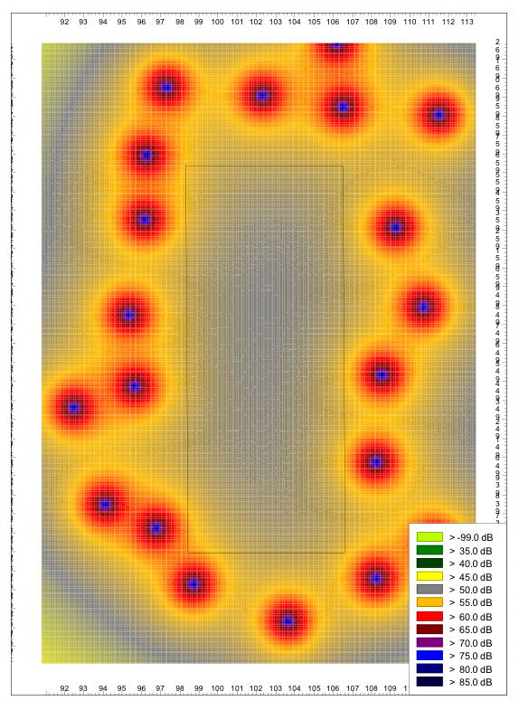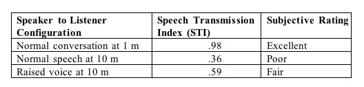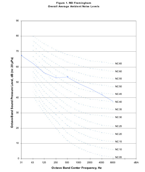 | This report summarizes acoustical analyses performed by David Coate Consulting (DCC) to address issues related to the mezzanine community area in REI's Conceptual Store. The community area is a space designed for training and educating staff about REI products. Normal conversation, lectures, and video presentations are examples of the types of communication that will be required in this space. The REI design team wants to retain a degree of openness of the community level to the rest of the store. The current design calls for transparent walls which would be open at the top. DCC analyzed the potential for speech interference caused by customer activity and various design recommendations to protect the acoustics of this space. Noise Measurements in Framingham, MA REI Store The most important parameter in determining the amount of potential sound intrusion into the mezzanine level is the general ambient noise level in the store. Ambient noise sources include customer activity, music and paging from loudspeakers, and HVAC noise. REI staff suggested the Framingham, Massachusetts store as a candidate location for measuring in store noise. Obviously, store noise in yet to be constructed REI stores could vary from this, but it is unlikely that customer noise would vary by a large amount. Other noise sources are controllable, and customer noise should only increase by 3 decibels if customer activity were double that of the Framingham store. A three decibel increase is barely noticeable to most people.   DCC collected noise measurement data at the Framingham location on March 17, 2007 and March 30, 2007 for a total of eight hours at eight locations within the store. Four locations were established on a grid system on each floor and then averaged to generate an overall store spatial average. The overall frequency spectrum of these measurements is shown in Figure 1.  Figure 1. REI Framingham Overall Average Ambient Noise Levels This ambient noise spectrum is at NC 50 which falls in the range typical for shops. Community Area Sound Levels DCC employed two different computer modeling techniques to estimate store-generated noise levels within the community area. Room acoustics modeling requires sophisticated software and it turns out that analysis of the noise barrier effects of the partial height mezzanine walls is a very complex room acoustics problem. DCC used CADNA, an environmental noise prediction program, to analyze the noise barrier effects, and EASE, a room acoustics program to analyze the absorption effects of architectural finishes. The effects of reverberation (sound scattering off of various surfaces) could be an important issue because sound could reflect off of the 2nd floor ceiling, and then over the top of the mezzanine wall. That is, the extent of absorption treatment on the 2nd floor ceiling could affect how much sound actually passes through those openings into the community area. DCC modeled noise levels on the 2nd floor of the prototype store using the measured data shown in Figure 1, represented by twenty point sources randomly distributed on the second floor. The number of point sources is somewhat arbitrary, but they represent a moderate to high number of customers (i.e., customers are the point sources). Figure 2 shows the results of this modeling. The overall spatial average (i.e., the average of all the colors in the figure) matches the data in Figure 1. Next, DCC modeled the mezzanine level, specifically the barrier effects of the partial height mezzanine walls, using the 2nd floor noise model as the noise source. This model assumed a mezzanine floor elevation of 3.5 meters, top of glass wall elevation of 7 meters, second floor elevation of 6.09 meters, and 2nd floor ceiling elevation of 10.6 meters. Figure 3 shows the results of this analysis- the estimated store generated noise levels penetrating into the community area. This modeling exercise shows that mezzanine levels would be at about 44 dBA. The combination of the barrier effect of the glass walls, and physical distance from the noise sources would provide approximately 10 dBA noise reduction.  Figure 2. CADNA Model of Second Floor Noise Levels  Figure 3. CADNA Modeled Mezzanine Noise Levels Speech Intelligibility Based on the estimated ambient noise spectrum in the mezzanine, the level of speech intelligibility can then be estimated. That is, in order for speech to be intelligible, the sound pressure level of the speech has to be higher than the ambient noise level by a certain amount. The Speech Transmission Index (STI) is a quantitative measure of speech intelligibility, where 0 is completely non-intelligible, and 1 is completely intelligible. There are also subjective ratings for STI values between 0 and 1. Table 1 shows the results of the STI analysis for the community area for various speaker to listener configurations. Table 1. Speech Intelligibility in the Community Area   The data in Table 1 shows that there will be no problems associated with normal conversation in the community area. However, there will be problems understanding unamplified speech for someone presenting at a lectern to a group of people seated within the community area. Consequently, in this configuration, speech will need to be amplified via a lavaliere or lectern microphone through an appropriate sound system. Loudspeaker to listener distances may need to be adjusted, along with overall sound system levels, so as to not create excessive noise within the 2nd floor store area. Reverberation in the Second Floor Retail Area The previous analysis is based on the assumption that the acoustics in the 2nd floor retail area will have no effect on sound entering the mezzanine area. However, it is likely that reverberation and reflections from the 2nd floor ceiling will cause higher noise levels in the mezzanine than assumed in the previous section. In order to address this issue, DCC modeled reflections using EASE room acoustics software. Room 