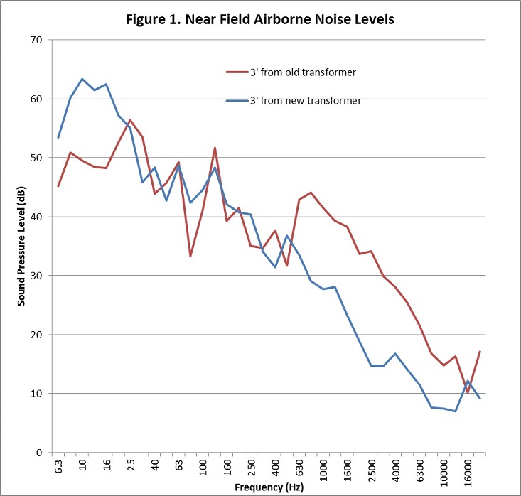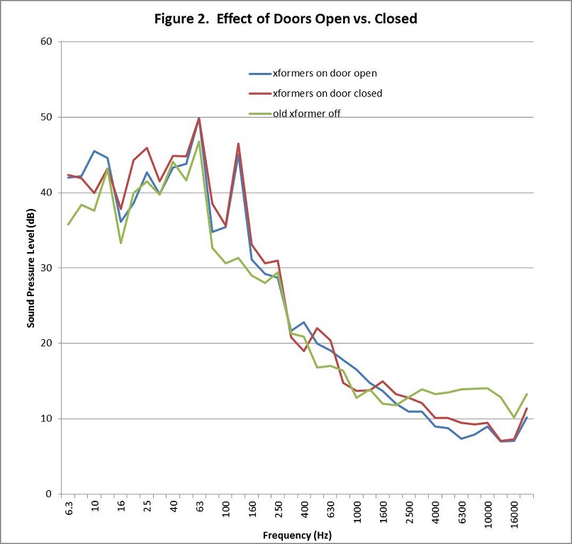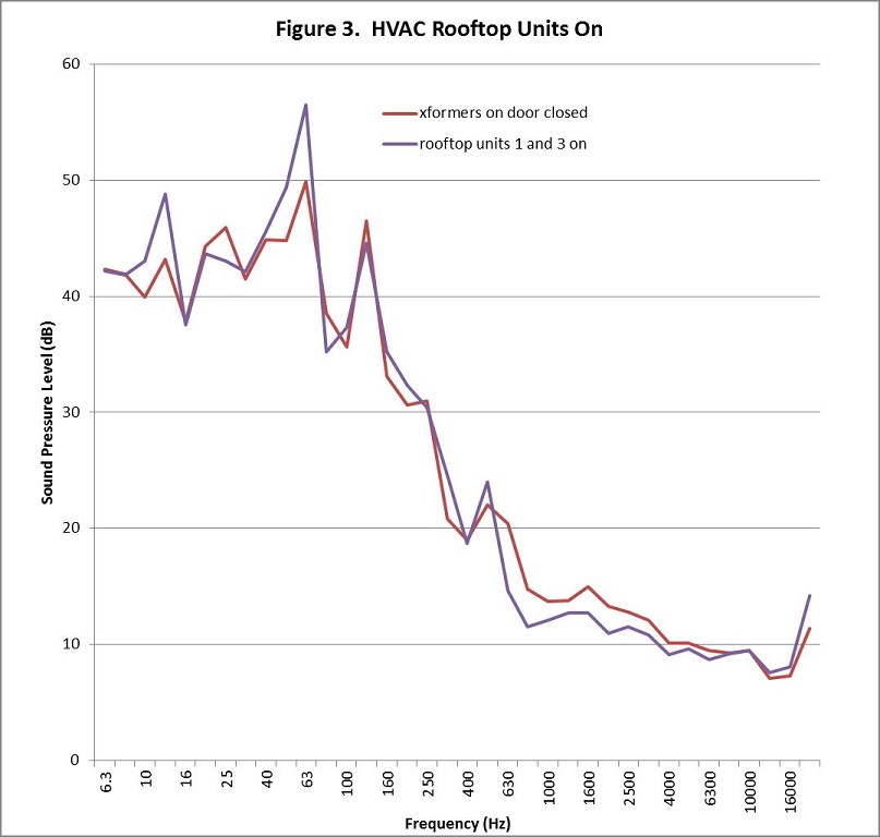 |  Tonal noise and HVAC noise is noticeable in the broadcast studio of WACV- TV station in Ashland, Massachusetts. In turn, this unwanted noise is recorded on the studio’s audio recorder via microphones situated in the studio. At your request, David Coate Consulting (DCC) performed noise and vibration tests in the facility on July 25, 2014. David Coate Consulting (DCC) performed various tests and analyses to determine what acoustic treatments would be required to meet these design criteria. Summary The tonal noise is caused primarily by the older of the two station’s transformers. Analysis of the measurement data indicates that structural vibration at harmonics of 60 Hz (mainly at 120 Hz) appears to be the main cause of the noise. In this case, building elements such as the ceiling and wall adjacent to the transformer are vibrating and generating noise analogous to a large loudspeaker. HVAC noise in the studio is also significant. The new transformer also generates vibration/noise in the studio, but at lower levels than produced by the old transformer. While this does not appear to be an airborne noise issue, that cannot be absolutely confirmed without first installing proper vibration isolators on the transformer(s). The Recommendations section of the report provides details on vibration isolation of these units. Given the complexity of the situation including the HVAC noise issue, I recommend that various modifications be made in steps incrementally to see how each step affects studio noise levels. Published “Noise Criteria” for television broadcast studios recommends a maximum of NC 25. With the HVAC and transformers on, noise measurements in the studio indicate NC 28. However, the NC method does not adequately account for tonal noise, so the small increase from NC 25 to NC 28 understates the problem. With HVAC and the old transformer off, the measurements indicated NC 18 which gives a better indication of the extent of influence of HVAC and transformer noise (i.e., NC 18 vs. NC 28). Noise and Vibration Measurements and Analysis Airborne Noise from Transformers In order to compare airborne noise levels of the two transformers, noise measurements of each were taken 3 feet away from each unit. Figure 1shows that the old transformer generates higher noise levels than the new transformer, but only by about 3 decibels at the problematic 125 Hz tone.  As a matter of fact, the higher noise levels at 630 Hz and above were likely caused by another noise source such as the rack of equipment also in that room. During the field tests, because of the overall higher airborne noise level of the old transformer, I initially suggested replacing it with a new one. That approach may still be warranted at some point, but since the 125 Hz tone is only 3 dB higher and other data (described below) indicates this is a vibration problem, it makes sense to first install proper vibration isolation. Effect of Mezzanine Doors The next test employed was to determine the effects of the two doors in the studio leading to the mezzanine level. Figure 2 shows that the two spectra, “doors open” and “doors closed” are nearly identical. Therefore, it does not appear that these openings are a major path for airborne noise from the transformers. As a matter of fact, this lends credence to the probable structural vibration cause since vibration would be unaffected by the doors being open or closed.  Figure 2 also shows the effect of the old transformer turned off. As can be seen in this figure, the 125 Hz tone is essentially non-existent, a full 15 dB lower than with the old transformer on. This data clearly shows that the old transformer is causing the 125 Hz tone in the studio. HVAC Noise The next test was to determine the effects of the HVAC noise. Figure 3 shows the frequency spectrum with rooftop units 1 and 3 on. With the HVAC on, overall levels increased from 27 dBA to 32 dBA. It can be seen from the figure that noise levels at certain frequencies increased. At this time, it is not clear why the 60 Hz peak increased so much. In other words, there is no reason to expect that peak noise levels from the HVAC equipment would line up so precisely with the peaks associated with the transformer noise.  Transformer Structural Vibration-Induced Noise Vibration measurements were conducted by affixing an accelerometer to the studio wall adjacent to the transformer. These data were used to calculate the theoretical sound pressure level (vs. frequency) that would be generated by the vibrating wall. This data was compared with actual noise measurements 3’ from this wall. The two sets of data are in reasonable agreement, particularly at 125 Hz, which strongly supports the structural vibration probable cause. A separate airborne noise analysis was conducted to calculate the expected Noise Level Reduction (NLR) of the wall if this were an airborne noise issue. NLR data for a similar 6” wall was used and subtracted from the airborne noise level data measured 3’ from the transformer. This data shows that if this were an airborne noise issue, transformer noise should be at least 20 to 30 dB lower than it actually is. This separate airborne noise analysis also supports the structural vibration probable cause. Existing Vibration Isolation of Transformers The two transformers are currently connected to the ceiling trusses via a metal frame which is not connected to the floor. The bases of the transformers are resting on 4 vibration isolators which appear to be a very high (hard) durometer neoprene or rubber. This type of material is typically used for vibration isolation for much heavier equipment (the transformers weigh about 300 lbs.). Using static deflection data from a similar appearing rubber product, and PSI data versus load data, the deflection of these isolators could be as low as .005 inches. With such a low deflection, much of the vibrational energy from these units is probably being directly transmitted to t