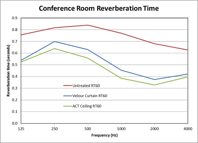 | Introduction David Coate Consulting (DCC) conducted a site visit of Avention’s new office space build out in Concord, Massachusetts. The main objective of this study was to perform acoustical tests in the main existing conference room and recommend acoustical treatments to improve the acoustics in the space. Interior finishes in that space are highly reflective and cause problems both in terms of speech intelligibility within the space as well as speech intelligibility during conference calls via microphones located in the conference room. In addition, DCC reviewed (but performed no acoustical tests) the acoustics in the • Conference room currently under construction • Open office area • Lobby Main Conference Room Excessive reverberation is the cause of the speech intelligibility issues in the main conference room. “Reverberation” refers to the combined effect of multiple reflections within a space. Reverberation increases with increasingly hard/reflective surfaces and size of the room. In general, speech intelligibility decreases with increasing reverberation time. The RT60 (reverberation time) is the time in seconds for sound levels to decay 60 decibels (dB). Very reverberant spaces, such as gymnasiums, may have RT60 values of 3 to 5 or more seconds. Recommended criteria for conference rooms is 0.6 to 1.4 seconds, in the mid-frequencies. Using a high performance sound system to excite the space with pink noise bursts, the RT60 was measured at 15 locations within the conference room. The data was processed in octave frequency bands using a real time spectrum analyzer. Figure 1 shows the results of these tests. Existing conditions are labeled “untreated RT60” which reveals that the maximum RT60 occurs in the mid-frequencies (e.g., 500 Hz) at 0.8 seconds. While this value does fall within the acceptable range for conference rooms, so called “specular reflections” or discrete reflections between hard parallel surfaces compound speech intelligibility issues in this space. It is likely that speech intelligibility would be noticeably improved by reducing the RT60 to 0.6 seconds and by reducing specular reflections. Specular reflections can be addressed by adding acoustical absorption to at least one of the parallel reflective surfaces.  Acoustical Model and Recommendations Conference room dimensions, architectural finishes, and measured RT60 data were used to develop a computer model to replicate the existing acoustics. Next, various acoustical absorption treatment options were auditioned in the model to reduce the reverberation time to an acceptable level. The “Velour Curtain RT60” curve in figure 1 corresponds to the addition of an 18 Ounce weight or greater (heavy) velour curtain that would cover the existing glass wall. The performance of this treatment relies on maintaining several inches of airspace between the curtain and glass. The curtain could be retracted at times, but for optimum acoustics the curtain would need to essentially cover the glass wall. A second treatment option, covering the entire ceiling with Acoustical Ceiling Tile (ACT), was also analyzed and the results are shown in Figure 1. The treatment assumed was 5/8” thick absorptive ACT. This treatment option has slightly better reverberation time performance than the velour curtain option, also with a mid-frequency RT60 at 0.6 seconds. However, the velour curtain option would likely reduce specular reflections somewhat better than the ceiling treatment option simply because glass is a highly reflective surface. The untreated Speech Transmission Index for this room is 0.84. STI ranges from 0 to 1, with 1 being equivalent to 100% speech intelligibility. Assuming a 10 foot separation distance between speaker and listener, 84% of speech would be understandable in this room. Either treatment option would increase the STI to 0.93 or 93% speech intelligibility. Please not that this should also improve speech intelligibility via the microphones in the space, but these STI values would not apply to off-site listeners. Either treatment option will also reduce overall sound levels in the space by a few decibels. Ideally, the curves in Figure 1 should be relatively flat, but achieving better low-frequency performance would require a different type of absorber with a deeper airspace behind it, which would be more difficult and expensive to construct in this retrofit situation. Conference Room Under Construction The conference room under construction has smaller dimensions and volume than the main conference room and therefore its RT60 should be inherently lower than that of the main conference room. However, similar acoustic treatment schemes such as discussed in the main conference room section could be employed with similar benefits. Specular reflections should be avoided by avoiding hard reflective parallel surfaces. We recommend an RT60 of approximately 0.6 seconds for this space. Open Plan Office Space The open plan office space has several acoustical issues which affect speech privacy. The central office area has cubicles very close to one another which cause speech privacy issues between cubicles and also customers on phone calls. The main parameters that affect this issue are: 1. Proximity of cubicles to each other 2. Height of cubical walls 3. Sound masking 4. Sound absorption within each cubicle Increasing the height of cubical walls would improve speech privacy to some degree based on how much the line-of-sight between speaker and listener was broken by the wall. In this case, wall heights (or glass) could be extended a modest amount to break this line-of-sight. That in turn should result in a 5 dBA improvement which would be noticeable. Please note that if glass is used to provide this extension, it should be as massive as possible (tempered or laminated), with no gaps between the walls and glass. Sound absorptive materials such as the material on the existing cubicle walls can help reduce the a