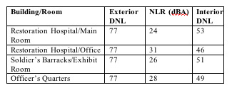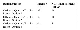 Officer's Quarters, were selected for a sound insulation feasibility study. NLR Testing Using a pink noise source, a high-powered full range sound system, and an octave band analyzer, I measured broadband noise at the exterior and corresponding interior spaces of these buildings. Table 1 shows the results of this test for representative rooms in these buildings. Table 1: Noise Level Reduction Test Results-Existing Conditions   The NLR values shown in Table 1 are modeled results, calibrated by the measurements. In addition, since noise reduction testing is dependent upon the spectrum of sound used for the test, the octave band analyses were adjusted using a reference spectrum of a Boeing 727 aircraft. The windows in Restoration Hospital include interior storm windows, which result in high existing NLR values, particularly in the office. There are large gaps at the perimeter of the doors in the main room that account for the relatively poor NLR in that room. The windows in the Soldier's Barracks and Officer's Quarters do not include storms. Many of the rooms in the Soldier's Barracks and Officer's Quarters have vestibules, which normally would provide substantial attenuation of sound, but in many cases the outer door has large gaps at the perimeter which allows significant amounts of sound energy to enter the rooms. All three buildings are constructed of masonry, which is an excellent material for sound isolation. However, the entire building envelope including potential paths through windows and doors, must be uniformly robust in order to achieve sound isolation to meet FAA requirements. The FAA requires that sound isolation treatments must reduce interior noise levels to 45 DNL or lower with a minimum 5 dBA NLR improvement. Acoustical Modeling The goal of the acoustical modeling is to predict existing conditions NLR and future conditions (i.e., with treatments installed) NLR (or NR for short). The acoustical modeling takes into account wall, window, and door construction, room dimensions and calculated acoustical absorption within the room. The acoustical modeling showed reasonable agreement between predictions and measurements. Acoustical Treatment Recommendations Acoustical treatment recommendations are discussed below for each of the buildings listed in Table 1. This discussion is not intended to comprehensively address all treatment issues for each house, but instead focuses on the most important acoustical issues for each particular building. Restoration Hospital/Main Room The predominant acoustical path into this room is currently through the doors, caused by the large gaps around the perimeter of the doors. Consequently, the primary recommended treatment in this room would be to replace the existing exterior door with a new 1-3/4" tight fitting door and replace the existing screen door with a 1-3/4" tight fitting door with a 9" airspace between the doors. In addition to this treatment, three optional window treatments were evaluated:
