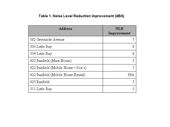 |   Introduction Noise Level Reduction (NLR) tests were performed by David Coate Consulting (DCC) before and after the installation of sound insulation treatments for the Group 2 homes in the Pease Tradeport Residential Sound Insulation Program (RSIP). The sound tests determine the NLR of the composite house construction, that is, the capacity of all the construction elements (walls, roof/ceiling, windows, doors, and other openings) taken as a whole to attenuate exterior sound in each room that was tested. However, the data is typically presented to show the effect of a particular window or door in a specific room because those typically control the NLR of the room. The NLR measurements are presented in octave bands (by frequency) and by overall A-weighted decibels (dBA) outside to inside. A weighting simulates the frequency response of the human hearing mechanism. Results The RSIP is designed to meet the goals stated in the FAA’s “Guidelines for the Sound Insulation of Residences Exposed to Aircraft Operations” (DOT/FAA/PP-92-5, October, 1992). This document indicates that homes within the 65 Day Night Average Noise Level (DNL) contours eligible for treatments would require an interior noise level of 45 DNL or lower and a 5 dB improvement after treatments were installed. The 5 dB improvement is required so that there is a noticeable reduction in aircraft noise. Sound insulation strategies attempt to improve the sound isolation characteristics of the building envelope by addressing the weakest paths into the building. The weakest paths usually are windows and doors. Window and door treatments usually involve adding mass and/or a deeper airspace. There are a number of homes in Group 2 which are historical or of non-standard construction which in some cases required non-standard treatment approaches. For example, historical homes may have an aesthetic requirement that windows not look modern or industrial, and blend into the historical look of the building. On average, the test results were as follows: • For initial conditions, the average NLR was 32 dBA. • For final conditions, the average NLR was improved to 38 dBA. • For final conditions, the improvement in NLR was on average 6 dBA. A ten decibel improvement would be considered a halving of the perceived loudness. In all cases, the average NLR improvement for an entire dwelling unit was consistently greater or equal to 5 dBA. An overall average NLR improvement value for one mobile home was not possible to obtain because the initial condition consisted of windows, while the final condition consisted of a glass sliding door. This change was made at the homeowner’s request. In its final condition, this particular building has excellent sound reduction characteristics, and is considered a successful part of the program. • All homes meet the FAA 45 DNL interior noise goal. The NLR testing actually understates the amount of improvement in buildings receiving air conditioning. The EPA has found that on average, the improvement in NLR afforded by allowing windows to be closed (with air conditioning) is 10 dBA. (reference- Information On Levels of Environmental Noise Requisite to Protect Public Health and Welfare With an Adequate Margin of Safety" (EPA, March 1974)) This improvement does not include the additional improvement provided by window and door sound insulation treatments. Octave Band Analysis The single A-weighted decibel value is a universally accepted method for reporting field sound tests. However, the overall A-weighted NLR is affected by the frequency spectrum of the source of sound. In general, the greater the amount of low frequency content, the lower the overall A-weighted NLR. Our octave band analysis revealed the following: • Improvements due to program treatments occur at 500 Hz and above. • For initial conditions, the dBA NLR value is controlled by the 500 Hz octave band. • For final conditions, the dBA NLR value is controlled by the 250 Hz octave band. Essentially, sound levels at frequencies higher than 250 Hz are reduced as a result of the deeper airspace provided by the treatments. Description of the Acoustical Testing Procedure The test procedures were conducted with calibrated equipment in compliance with FAA standards and in accordance with ASTM Designation E 966 “Standard Guide for Field Measurement of Airborne Sound Insulation Building Facades and Façade Elements.” This method uses a loudspeaker system and pink noise generator to generate broad band noise (essentially a flat frequency response of random noise) which is sufficiently loud enough to be easily measured indoors with windows and doors closed. The difference between measured noise levels indoors and outdoors is the NLR. Typically three to five rooms (if available) in a house were selected for testing in order to provide measurement results for representative rooms, windows, and doors. Octave band data and overall A-weighted NLR values were generated for both initial and final conditions for each room tested. Finally, the measured data were adjusted using a flat frequency response to compensate for the non-linear frequency response of the testing system. NLR measurements can vary substantially from one another due to the area of windows on the façade being tested, the amount of acoustical absorption in the room being tested, and other factors including the condition and the tightness of the seal of the window. In addition, anomalous low-frequency data can overstate the NLR performance, and in those cases, several measurements should be performed within a specific room in order to average out low-frequency anomalies in the test data. However, due to the limited testing time available for each house, only one measurement was done in each room tested. For this reason as well as other reasons for variation in specific window and door performance results, an average NLR improvement value is typically calculated for each house. Group 