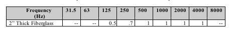 fiberglass with the following octave band sound absorption coefficients.