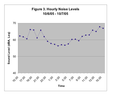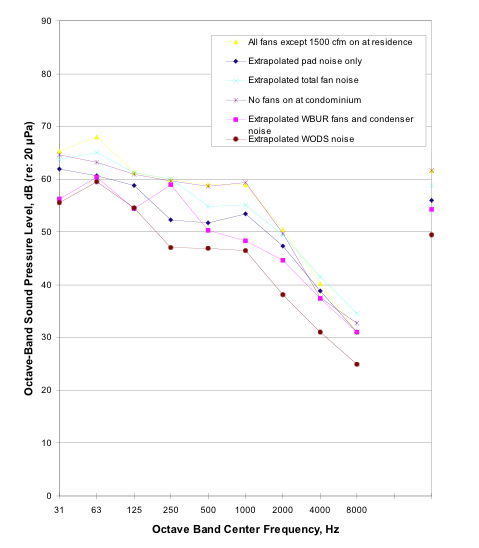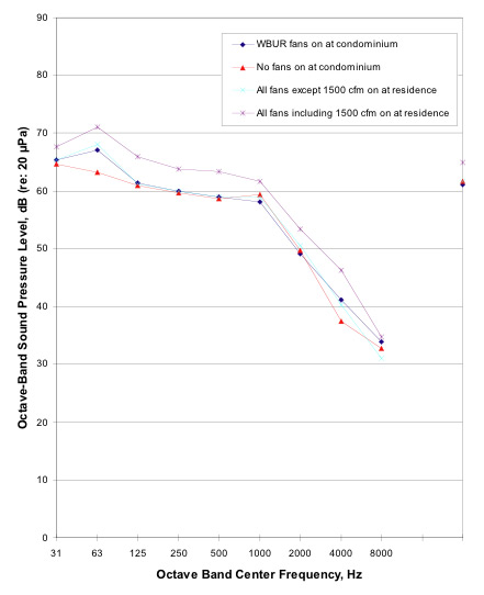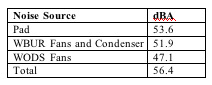 | Neighbors near the PAX television transmitter in Needham, Mass. were complaining about fan and equipment noise associated with the facility. DCC visited the television transmitter site on October 6, 2005. The purpose of the site visit was to measure the noise produced by the equipment for comparison with relevant criteria and to determine the highest contributors of sound at the nearby condominium. DCC measured equipment noise associated with several different equipment scenarios: 1) PAX pad only noise, 2) WBUR equipment only, 3) WBUR equipment and new condenser, 4) WODS equipment only, and 5) new PAX 1500 cfm fans. For each of these scenarios, DCC measured noise at distances of 10 and 20 feet away from the equipment to determine the distance attenuation rate. In addition, DCC measured noise associated with these scenarios at the nearby condominium. Traffic noise from nearby Route 128 is quite prominent at this location, and therefore it is not possible to completely isolate and separate out the contributions of the different equipment scenarios by noise measurements alone. However, it is possible to extrapolate the scenario contributions to this location based on the measured distance attenuation rates. Figure 1 shows measured spectra of all equipment, no equipment, WBUR fans, and the new 1500 cfm PAX fans at the condominium location. The 1500 cfm fans were clearly audible at this location, evident by how the spectrum exceeds the ambient noise spectrum. With all fans except the 1500 cfm fans running, it was d ifficult to distinguish fan noise from Route 128 vehicle noise. However, the data indicates that fan noise exceeds the ambient noise at 63 Hz. Late at night when Route 128 traffic noise dies down, fan noise would likely become more audible at this location. Figure 1. Transmitter Fan Unit Noise Measurements  Based on measured distance attenuation rates, Figure 2 shows extrapolated fan noise contributions at the condominium location. The logarithmic sum of the individual fan contributions is within reasonable agreement with the total measured noise, so the individual fan contribution extrapolations are reasonably accurate. This data shows that the pad equipment noise is the largest contributor, the next largest is the WBUR fans, and the lowest contributor is the WODS fans. However, the WBUR new added condenser produces the 250 Hz peak shown in the data, which is more noticeable than broad-band fan noise. Figure 2. Transmitter Fan Unit Noise Measurements, Extrapolated Fan Noise  DCC performed noise measurements over a twenty four-hour period at the condominium location using an automated noise monitor. This information can be helpful to show how noise levels change over that time period as well as for comparison with noise criterion such as the Day Night Average Noise Level (DNL). The DNL is essentially a 24 hour average with a 10 dBA nighttime noise penalty. Figure 3 shows the results of these measurements. The lowest hourly Leq value is 56 dBA which occurs around 3 am. That noise floor is very likely due to the equipment pad noise, because the A-weighted value of the extrapolated pad noise spectrum shown in Figure 2 is 56 dBA (The logarithmic sum of all three contributors is actually 58.8 dBA. The difference between this value and 56 dBA can easily be explained by additional attenuation caused by the intervening ridge and vegetation.). The higher noise levels during the dayÑup to 67 dBA-- correspond with Route 128 noise. The total DNL at this location is 66 dBA. This value exceeds acceptable criteria for residential use according to HUD, FHWA, and ANSI. Highway noise is the dominant noise source at this location and causes overall noise levels to exceed these criteria.  Table 1 shows estimated extrapolated noise contributions of the three noise sources, at the condominium location. Table 1. Extrapolated Noise Contributions of Fans at Condominium   The Boston Noise Code requires noise levels to be less than 60 dBA during the day and 50 dBA at night. Arguably, the fan noise should be mitigated to be below 50 dBA at night. However, this situation is unusual because fan noise is masked by highway noise many hours of the day. In addition, reducing fan noise will not reduce the overall DNL at this location. |