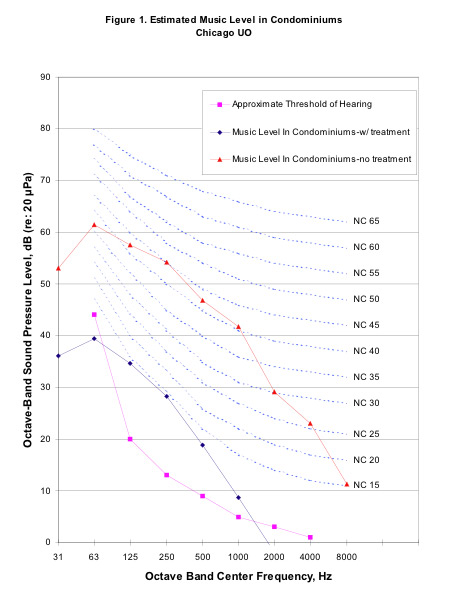 | Introduction DCC visited the UO location in Chicago, located at 1521 North Milwaukee Avenue, on March 17, 2005. The purpose of the site visit was to get a feel for what sound isolation treatments will be required for residential condominiums located on the third floor above the UO space. I believe that this particular situation has more stringent acoustical requirements than those that we have worked on to date, because of the potential for sleep disturbance. In addition, NC criterion for residential units is lower (NC 25-35) than for offices (NC 30-40), for example. While at the site, I attempted to measure the Noise Reduction (NR) of the existing floor/ceiling partition, but the data is invalid due to the fact that there were large gaping holes in the floor as well as open stairwells and elevator shaft that allowed sound from the loudspeaker source to influence the measurements. Preliminary Sound Isolation Treatment Options Ideally, the treatment for the third floor would be to pour a concrete slab and install a resiliently supported ceiling below. This type of treatment would provide a high NR, which will be needed to insure minimal sound intrusion from UO-generated music. I understand that the structure cannot support a concrete slab, so this treatment option is not possible. A lower performance treatment option would be to suspend a 1 1/2" thick dense plaster ceiling with resilient ceiling hangers (such as manufactured by Mason Industries) with a 16" clear airspace between the wood floor and plaster. Half of that airspace (i.e., 8") should be filled with loosely packed fiberglass batting. My calculations assume that the plaster would be 13 lb/ft^2 in surface weight, so you would have the option of replacing the plaster with Gypsum Wall Board, as long as the total weight stays the same. Figure 1 shows estimated sound levels in the condominiums from UO-generated music (using Fanueil Hall data) with no treatment versus the suspended ceiling treatment.   Figure 1 shows that without treatment, music from the UO space would be at NC 45 and very audible. With the treatment, music would be at NC 15, which is a very large improvement, but the music could still be audible at that level. Please note that NC criteria are generally used for steady HVAC noise, not music. Therefore, meeting the residential NC criterion of 25 in this case works for HVAC noise, but may not for music. Another uncertain variable here is the ambient noise in the condominiums on the third floor. If there is moderate HVAC noise (example of ambient noise source on the 3rd floor), that could provide enough masking to render the music spectrum in Figure 1 inaudible. However, this data indicates that even with this treatment installed, there is a chance that UO would have to turn down the music to guarantee inaudibility of sound for all residents on the third floor. As the design of this space progresses, please keep in mind that there are several possible sound paths to the third floor that will have to be dealt with. Those paths include the elevator shaft, stairwells, and the roof at the second floor level. |